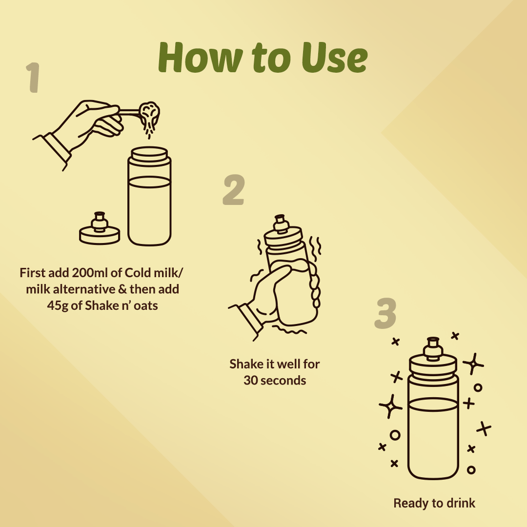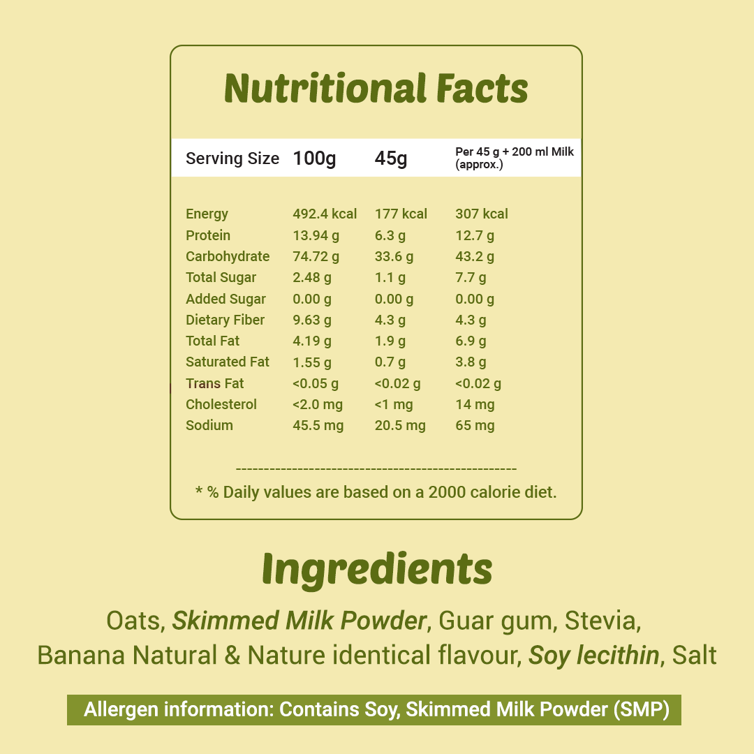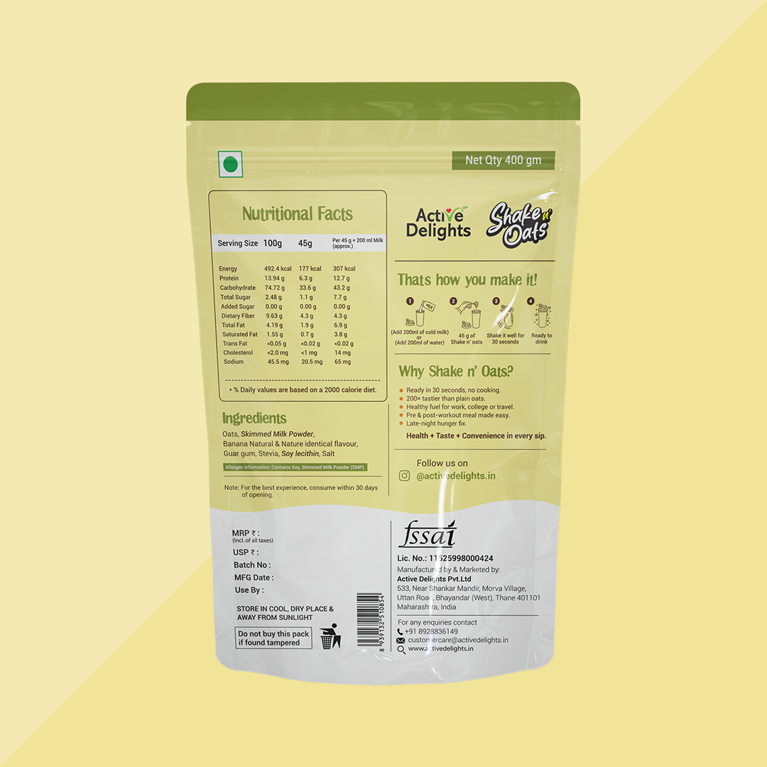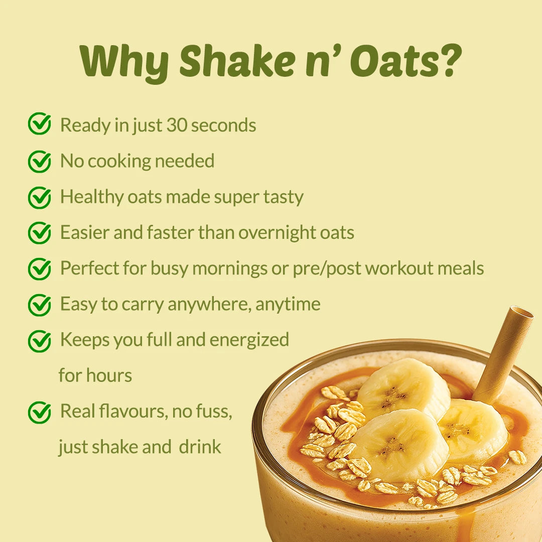 Shake n’ Oats Banana is a smooth, drinkable oats shake with a naturally sweet, mellow banana taste. Ready in just 30 seconds — add milk or water, shake, and enjoy a quick meal that’s both delicious and nutritious